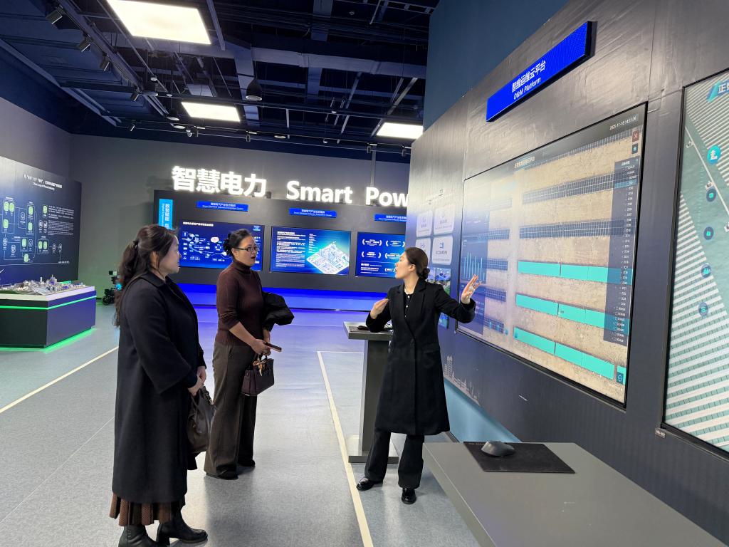 在正泰创新体验中心,邵书记、邢院长一行参观了企业核心业务展区,详细了解正泰在新能源领域的技术创新与产业布局。随后的智慧电力展厅环节,企业讲解员围绕“智慧电力”主题,展示了能源管理平台等数字化成果,双方就行业技术趋势、人才需求方向等内容进行了深入沟通。