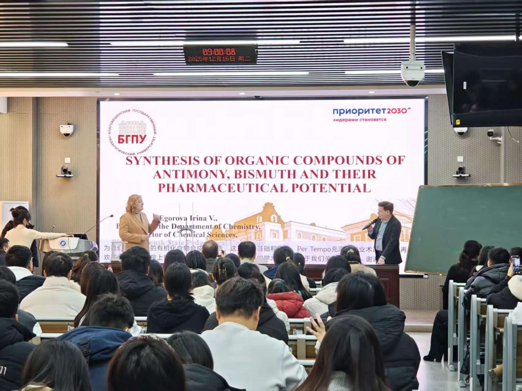 为搭建中外高校化学学科交流桥梁,拓宽师生学术视野,促进前沿科研与实践教学深度融合,betway中国西汉姆联官网于12月16日在实训楼404举办化学主题大师班。本次活动特邀布拉戈维申斯克国立师范大学国际教育与合作处处长尼古拉·弗拉基米罗维奇出席,化学系主任伊琳娜·弗拉基米罗夫娜教授、化学系副教授娜塔莉娅·亚历山大罗夫娜博士担任主讲嘉宾,孔子学院教务科科长谢尔盖·弗拉基米罗维奇提供全程翻译支持。