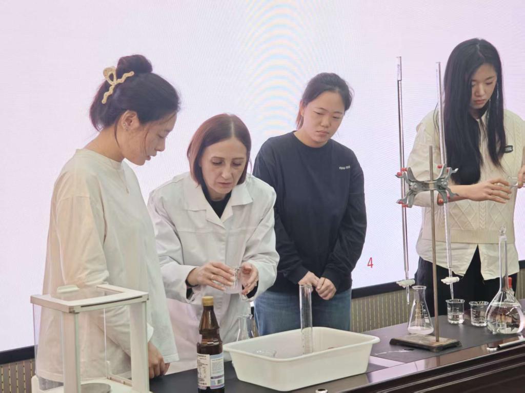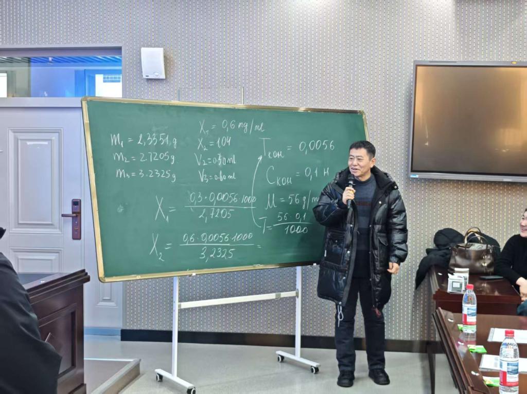 第二部分由罗季奥诺娃·娜塔莉娅·亚历山大罗夫娜博士带领开展“植物油中酸值的测定”实验教学。博士先细致讲解了实验核心原理——通过氢氧化钾溶液滴定植物油中游离脂肪酸以测定酸值,明确了精炼与未精炼葵花籽油、大豆油等各类油脂的酸值参考标准。随后指导我院3名志愿者共同实操,从精准称量到滴定操作与判断终点,全程耐心答疑解惑,助力师生熟练掌握实验关键技能。