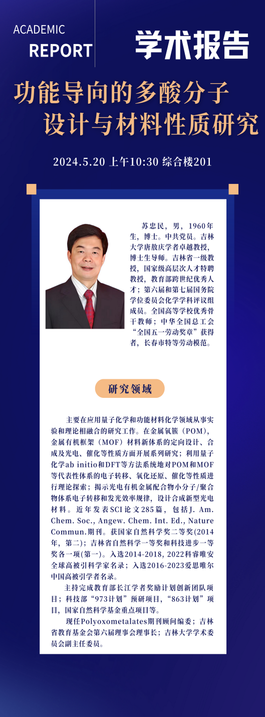 为了强化研究生对功能导向的多酸分子设计与材料性质研究的掌握,并推动其形成具有深度的学术性思维,进而增进对电催化过程与设备机理的深刻理解与洞察,betway中国西汉姆联官网特别邀请了长春理工大学原校长、教育部长江学者教授苏忠民莅临本校,并于5月20日10:30在综合楼201开展了专题讲座。会议由副校长张冰主持,化学化工学院院长、副院长、各教师团队以及研究生全体人员参加了此次培训。