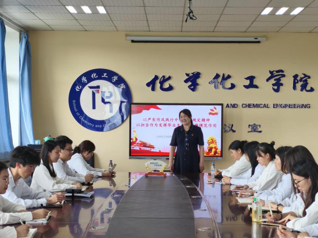 为进一步推进深入贯彻中央八项规定精神学习教育,充分发挥毕业生党员的先锋模范作用,化学化工学院党委书记邵艳秋于6月11日12:40在理工楼564室为学生党员讲授深入贯彻中央八项规定精神学习教育专题党课暨毕业生党员的最后一堂党课,本科生第一党支部全体党员及毕业生党员参加。