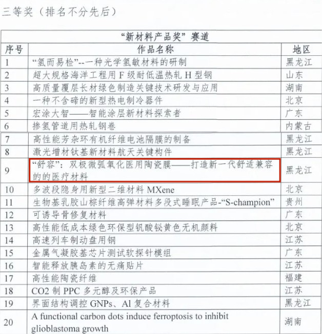 近日,工信部首届新材料创新大赛组委会公示了一、二、三等奖入围名单。经过层层选拔,激烈角逐,由化学化工学院郝国栋老师指导,2022级本科生霍佳慧带队的项目《“舒容”:双极微弧氧化医用陶瓷膜——打造新一代舒适兼容的医疗材料》在“新材料产品奖”赛道中荣获三等奖。