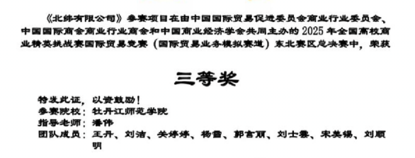 2025年05月31日更新 浏览次 喜报!化学化工学院学子在2025年全国高校商业精英挑战赛国际贸易竞赛(国际贸易业务模拟赛道)东北赛区总决赛中喜获佳绩 五月末,2025年全国高校商业精英挑战赛国际贸易竞赛(国际贸易业务模拟赛道)东北赛区总决赛圆满结束。经过校内选拔、区域竞技,我院多名学子取得佳绩。 2025年全国高校商业精英挑战赛国际贸易竞赛(国际贸易业务模拟赛道)东北赛区总决赛 此次竞赛的开展,充分展现了学校对学生国际贸易业务实践能力培养的重视。未来,学校将持续深耕实践育人路径,以赛事为依托,推动教学与实践深度融合,助力学子在国际贸易领域锤炼本领,为培育更多高素质应用型人才注入动能。