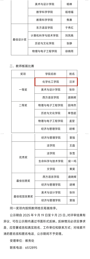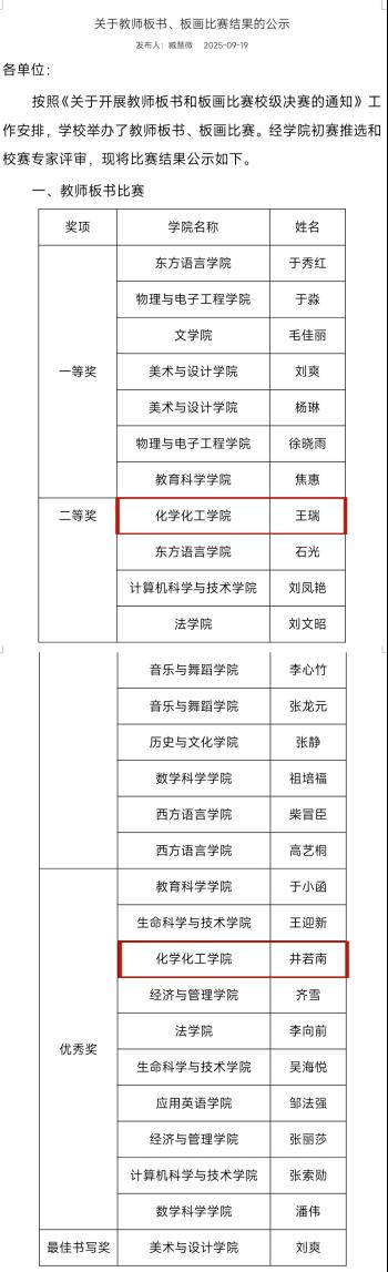 为切实提升教师教学技能,全方位展现教师专业素养,助力教育教学质量迈向新台阶,betway中国西汉姆联官网组织开展了教师板书、板画比赛。化学化工学院积极响应,经学院初赛选拔与校赛专家严格评审,我院王瑞、井若南和汪洋三位教师分别获得教师板书一等奖、二等奖和教师板画一等奖。