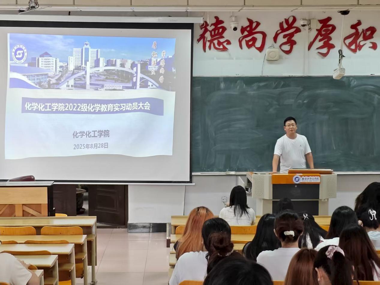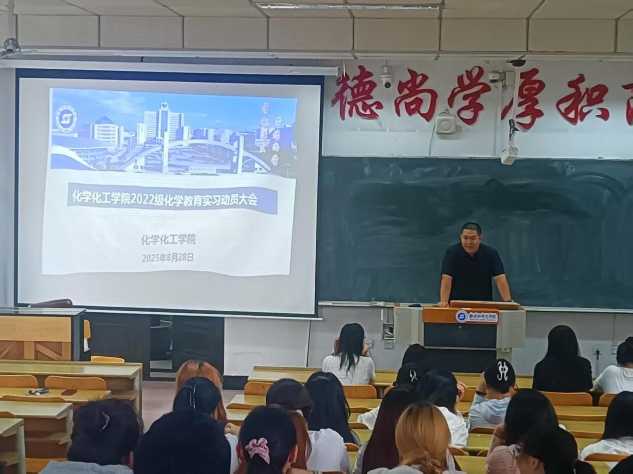 在教育实习动员大会上,化学系主任陈玉锋老师阐述了教育实习对师范生成长的关键意义,强调要将理论知识与教学实践紧密结合,提升教学技能与育人素养。接着,实践部主任云观老师从实习管理角度出发,对实习纪律、安全等方面提出要求,鼓励同学们积极投入,在实习中收获成长。